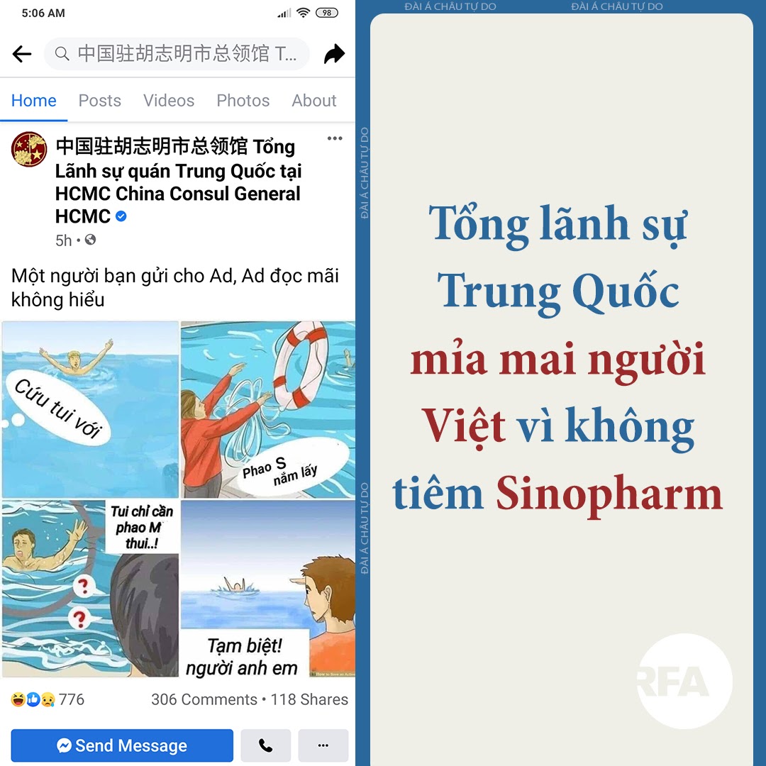 Fanpage của Tổng lãnh sự Trung Quốc tại thành phố Hồ Chí Minh hôm 21-8-2021 đăng tải hình ảnh biếm họa mỉa mai người Việt vì nhiều người từ chối tiêm vắc-xin COVID-19 của hãng Sinopharm.