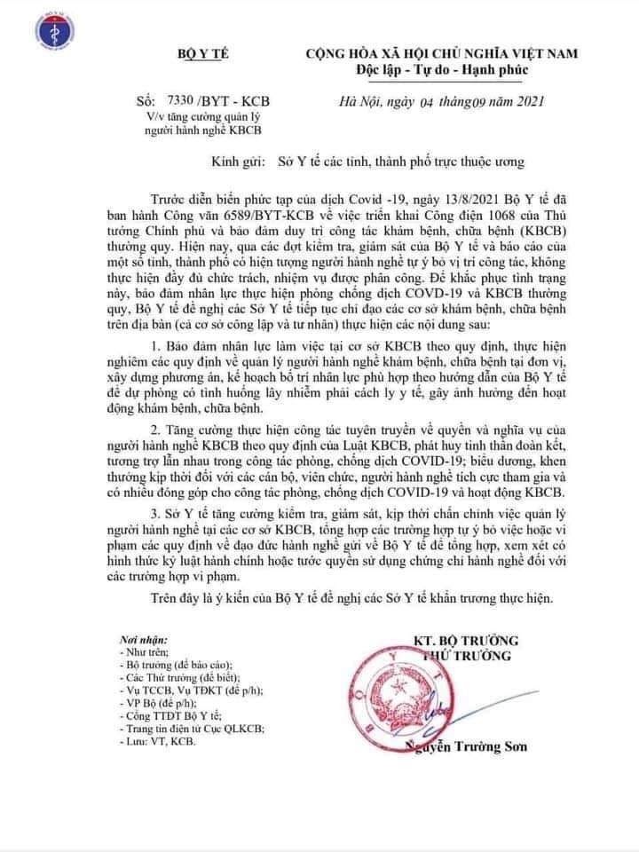 Công văn này nhằm cảnh báo tình trạng nhân viên y tế nghỉ việc hoặc không hoàn thành trách nhiệm do căng thẳng trong công việc, nhất là khi làm việc trong bệnh viện Covid